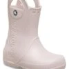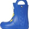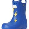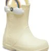 - Walk with confidence even on the rainiest days wearing Crocs™ Kids Handle It Rain Boots with waterproof build that keeps puddle-jumping feet cozy and dry and oversized handles that make them easy for kids to put on and take off. The calf-high rain boots are crafted with a ethylene vinyl acetate upper with squishy cloud motifs and ethylene vinyl acetate insole.